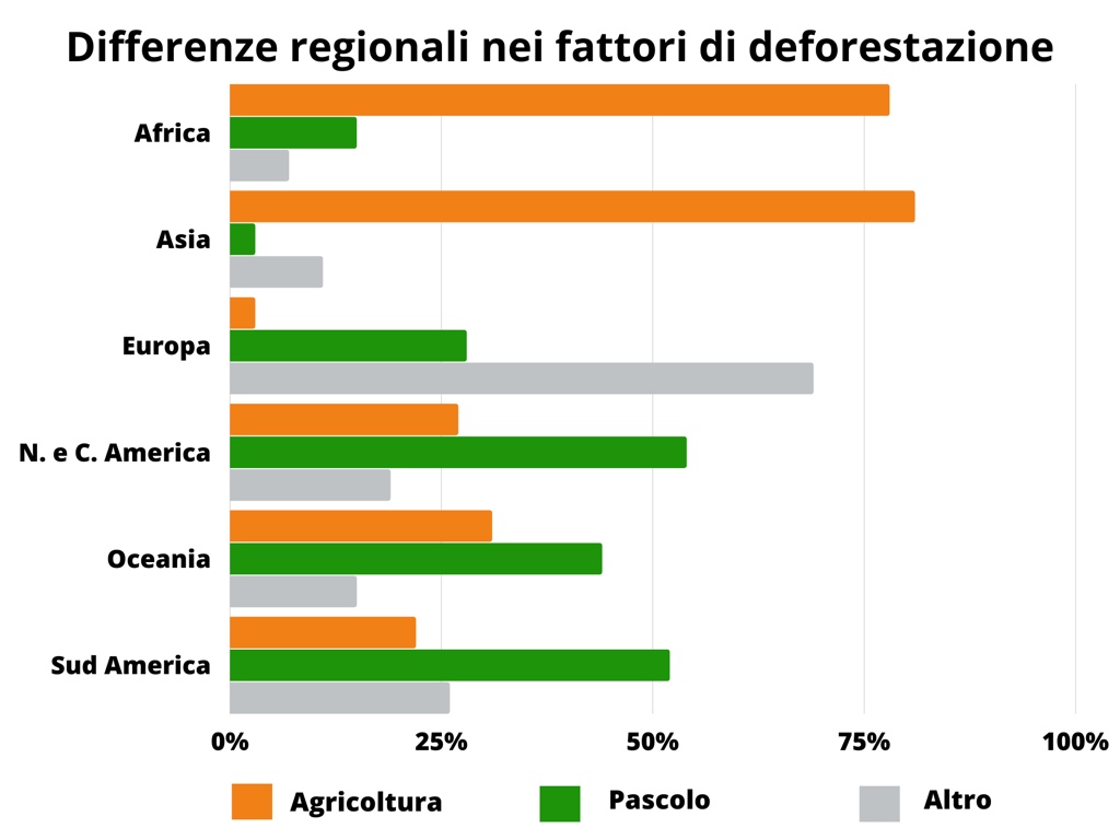 I dati più recenti indicano che tre quarti dei terreni agricoli sono destinati agli allevamenti intensivi, utilizzati per allevare gli animali ma anche per produrre gli alimenti per il loro sostentamento.