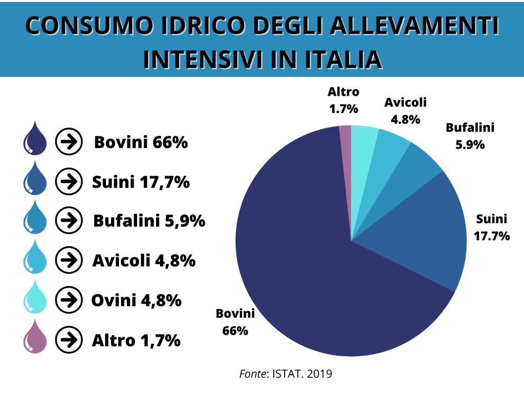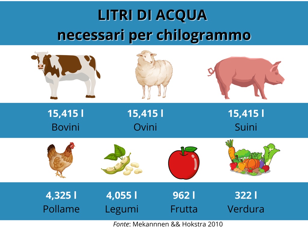 Per quanto riguarda il consumo di acqua i dati sono allarmanti, le informazioni che seguono sono state prese da google e indicano che “a livello globale secondo i calcoli di Mekonnen e Hoekstra, per produrre un chilo di carne in modo intensivo servono in media 15,400 litri d’acqua, 10,400 nel caso di carne di pecora, 6000 nel caso del maiale, e 4,300 per la carne di pollo”.