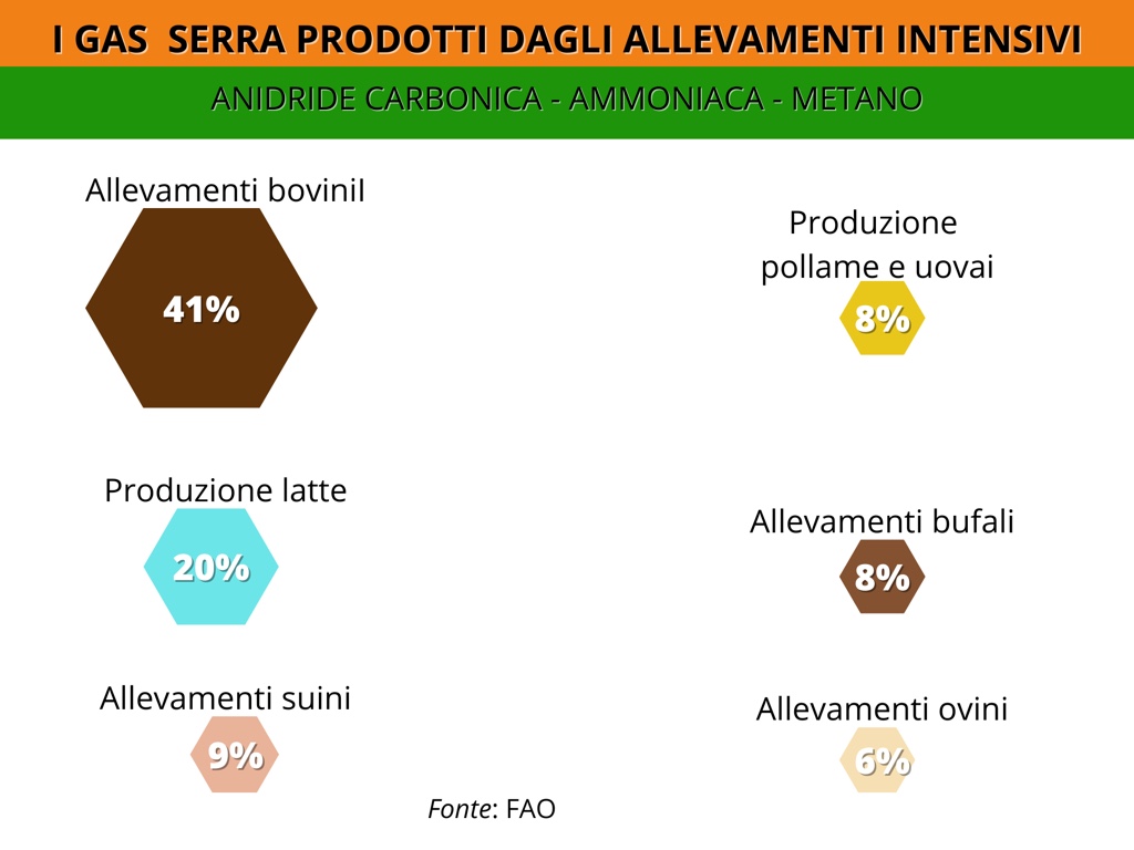 È ormai risaputo che gli allevamenti intensivi sono una delle principali cause di inquinamento; infatti, si calcola che solo in Italia producono il 75% delle emissioni di ammoniaca e il 44% delle emissioni a livello globale di metano.